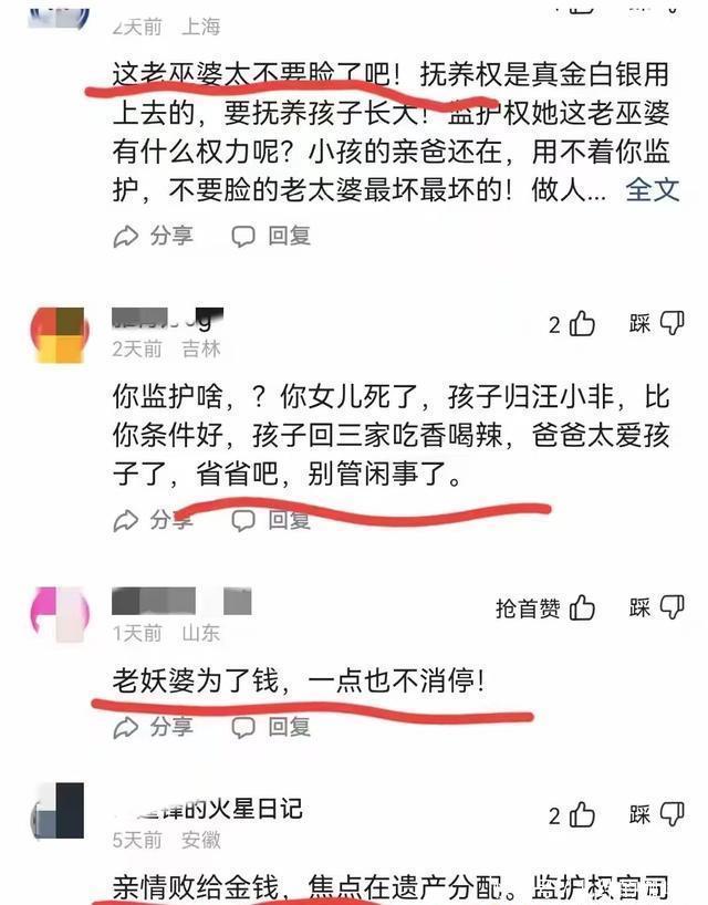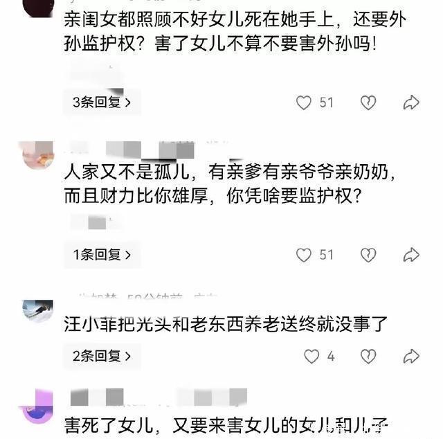 众网友说得好哇!一朝S妈拿到俩娃监护权,汪小菲的钱她就有借口拿了! 举个例子,过年汪小菲想带俩娃回京,S妈这个手持监护权的姥姥不开心,汪小菲就妄想带俩娃回京过年。