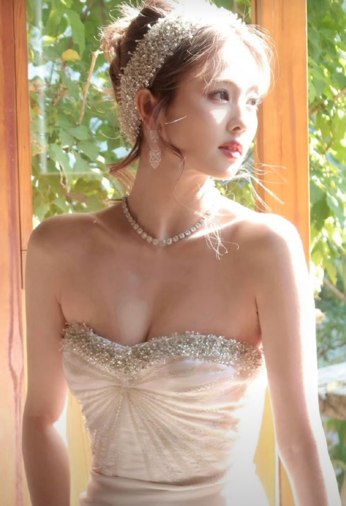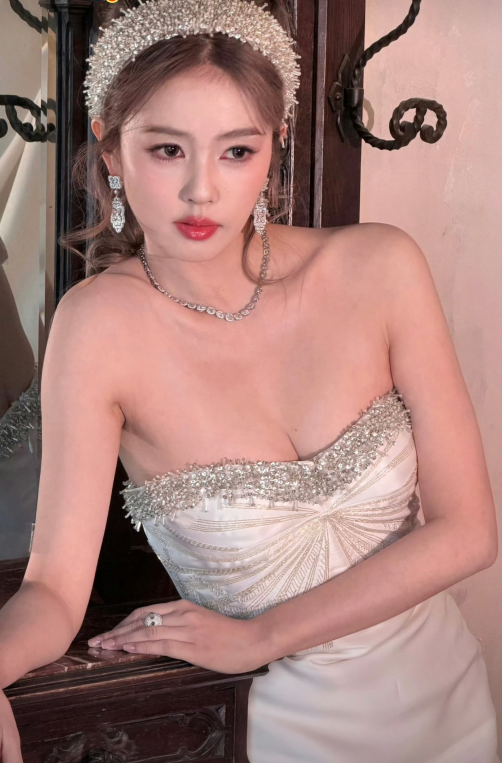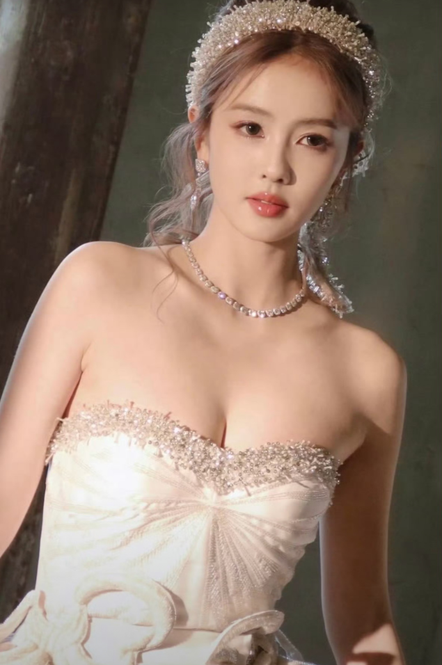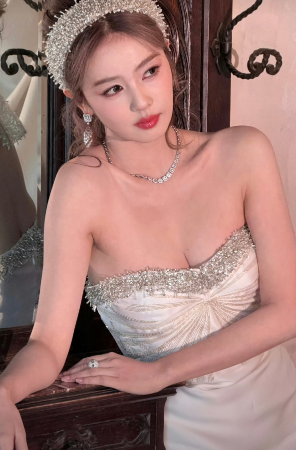 裙身齐全勾画出她优厚的肩颈与锁骨线条,畅达如诗;腰围纤秾合度,与臀线衔尾出恰到公正的弧度,尽显体态之好意思。上半身细巧的碎钻抨击在流光下熠熠生辉,与发间那顶同系列小巧冠冕遥呼相应,将总计东谈主衬得贵气翩然,又不失灵动。